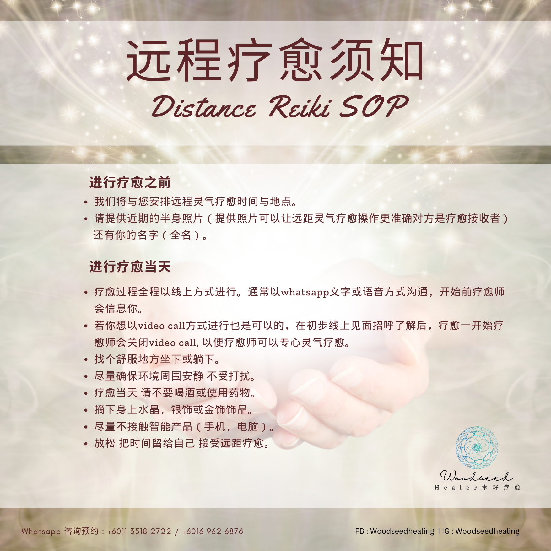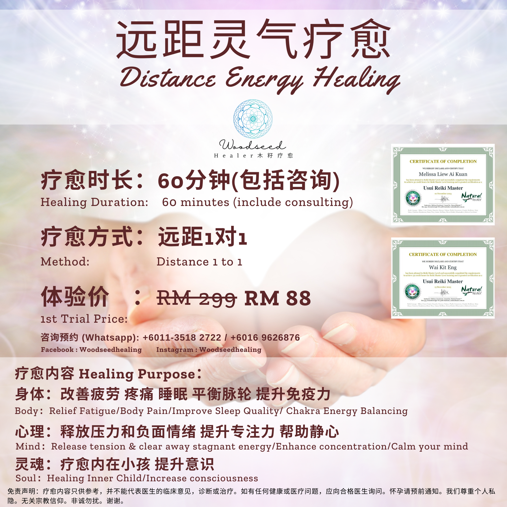 疗愈时长:60分钟(包括咨询)/ 疗愈方式:远距1对1 / 购买前,请填写以下问卷和报名资料,方便我们进一步了解状况和拟定适合的疗愈方案。 https://forms.gle/DTLVK5knfeBmk63F9